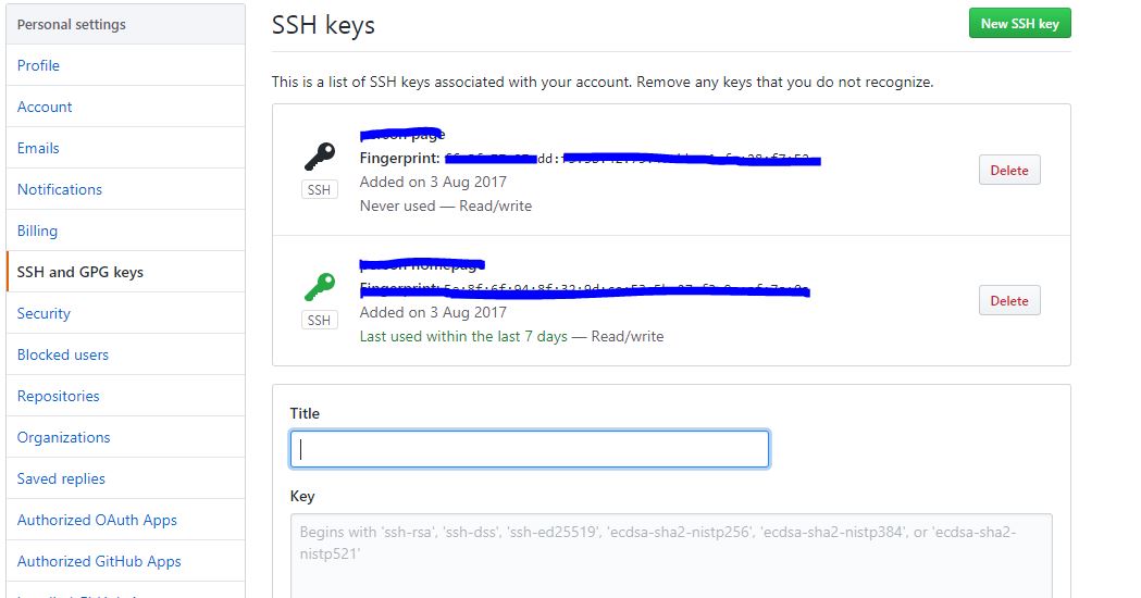 输入title,再把之前复制的id_rsa.pub内容粘贴到key中,点击Add SSH key