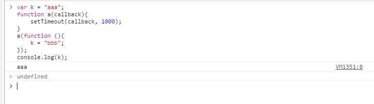因为异步执行的缘故,上面我通过设置一个延时(setTimeout)来模拟IO的耗时。当执行a函数时,里面的回调函数并不会立即执行,这是异步的调用。其实最后K变量的值已经改成‘bbb’了,只是已经执行过打印语句不会打印出来了。